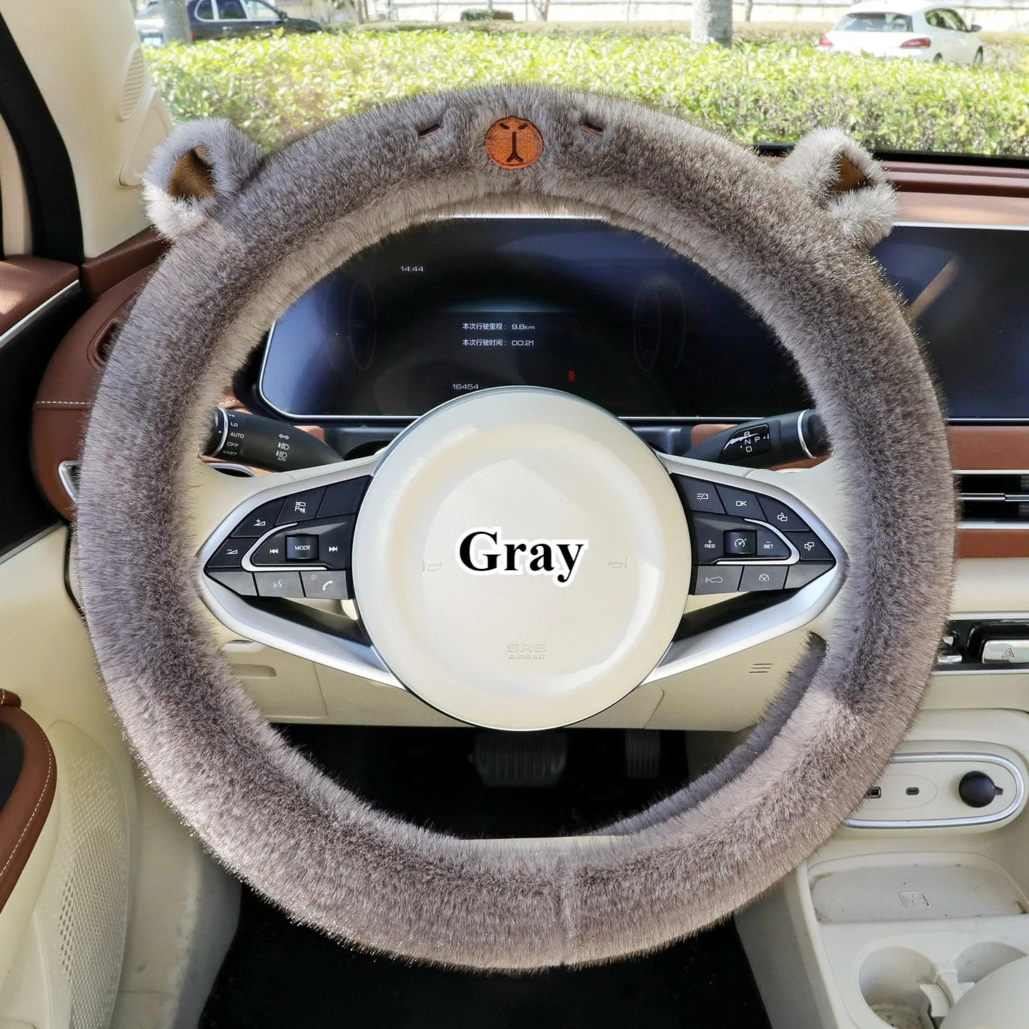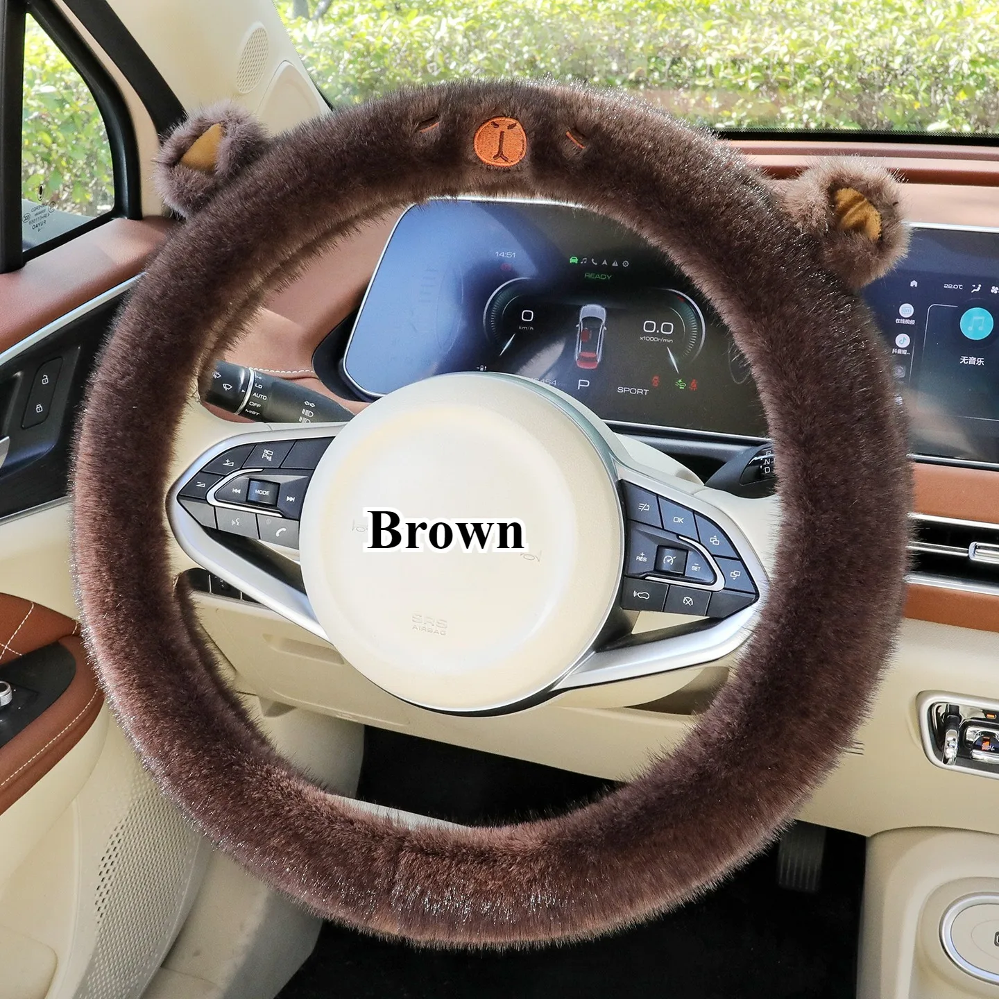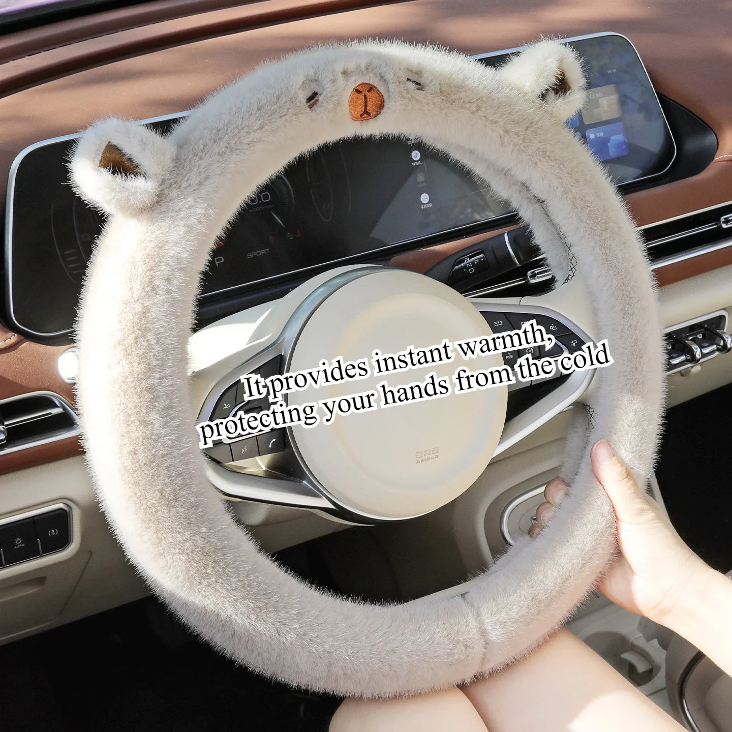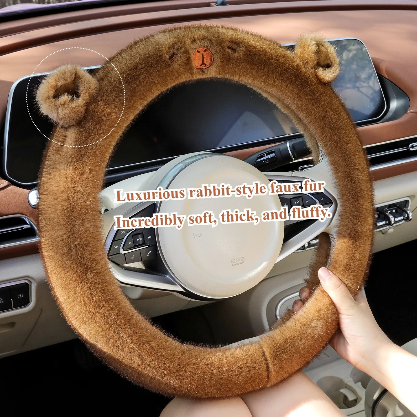 Premium Rabbit Fur Steering Wheel Cover with Ears Fluffy Soft Fleece Anti Slip Silicone Grip Cartoon Embroidery for Winter Cold
