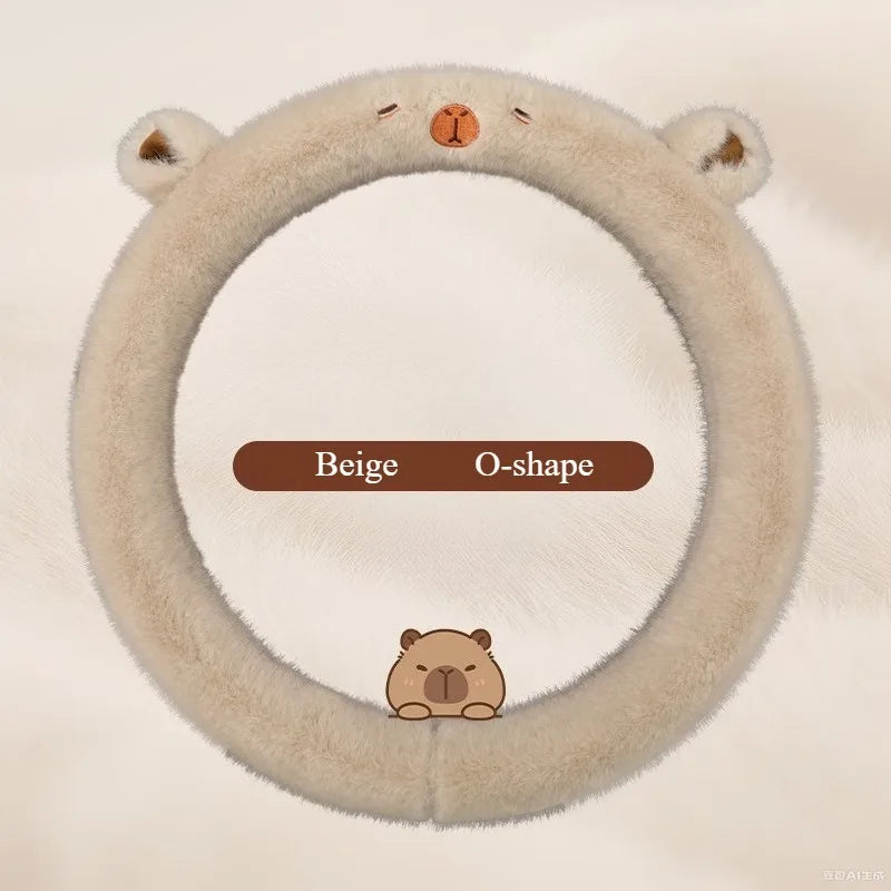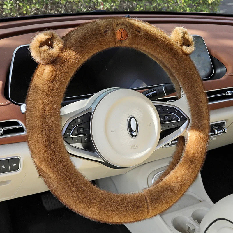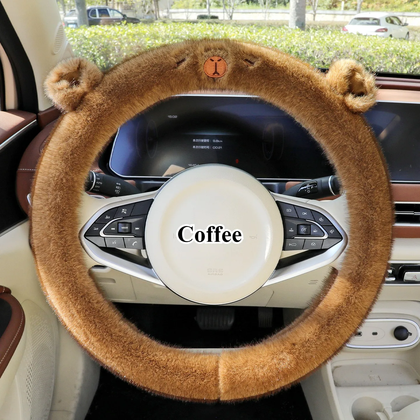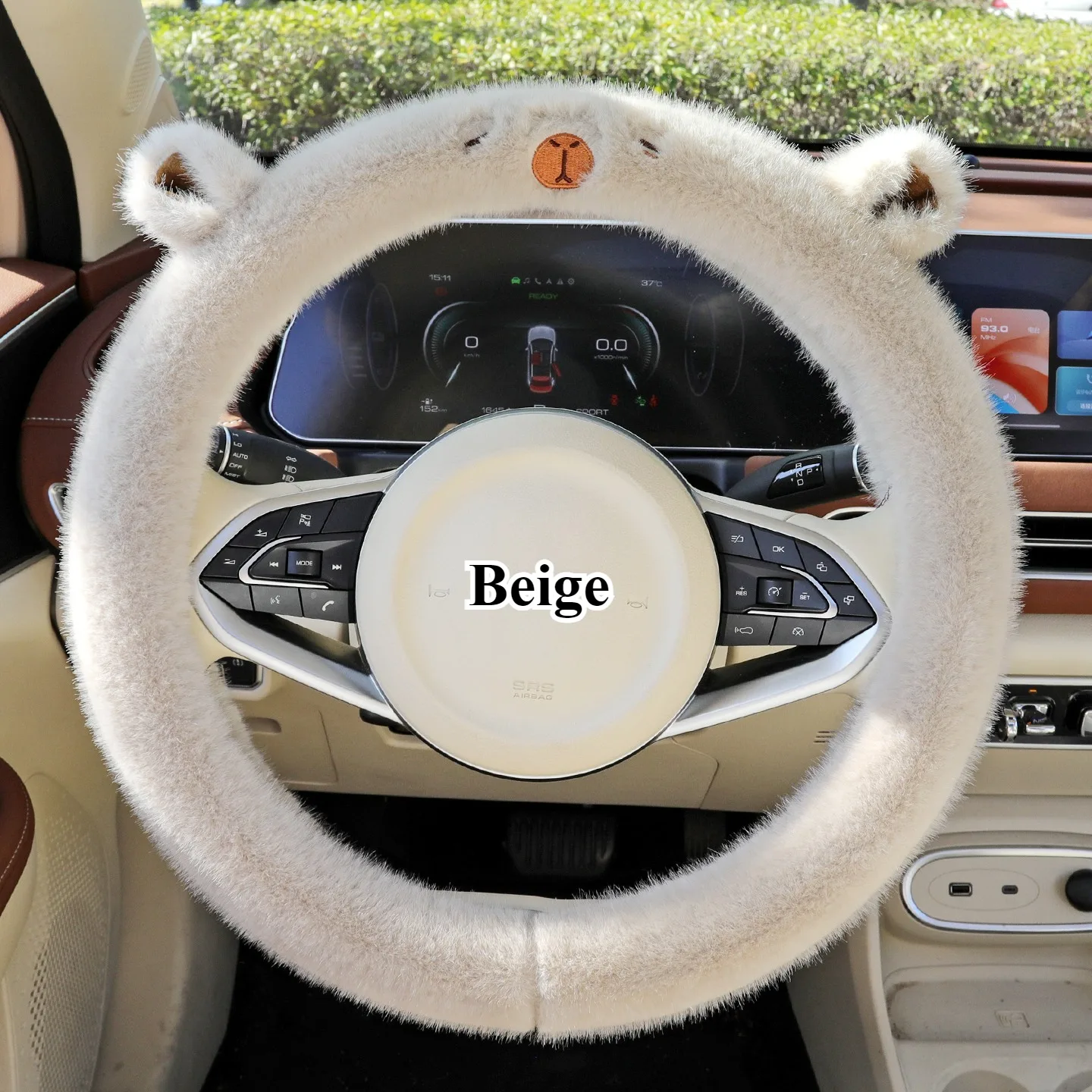 Premium Rabbit Fur Steering Wheel Cover with Ears Fluffy Soft Fleece Anti Slip Silicone Grip Cartoon Embroidery for Winter Cold